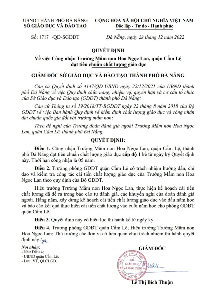 Quyết định công nhận Trường Mn Hoa Ngọc Lan đạt tiêu chuẩn chất lượng giáo dục Mức độ 1