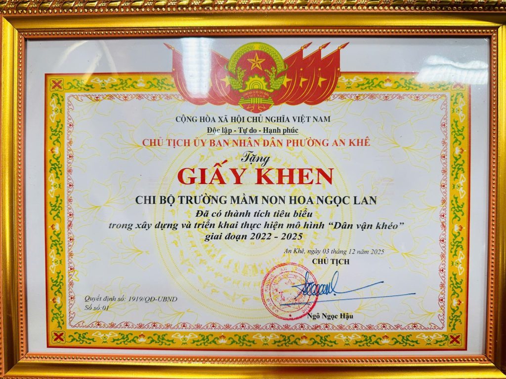 Giấy khen Chi bộ đã có thành tích tiêu biểu trong xây dựng và triển khai thực hiện mô hình “Dân vận khéo” giai đoạn 2022–2025