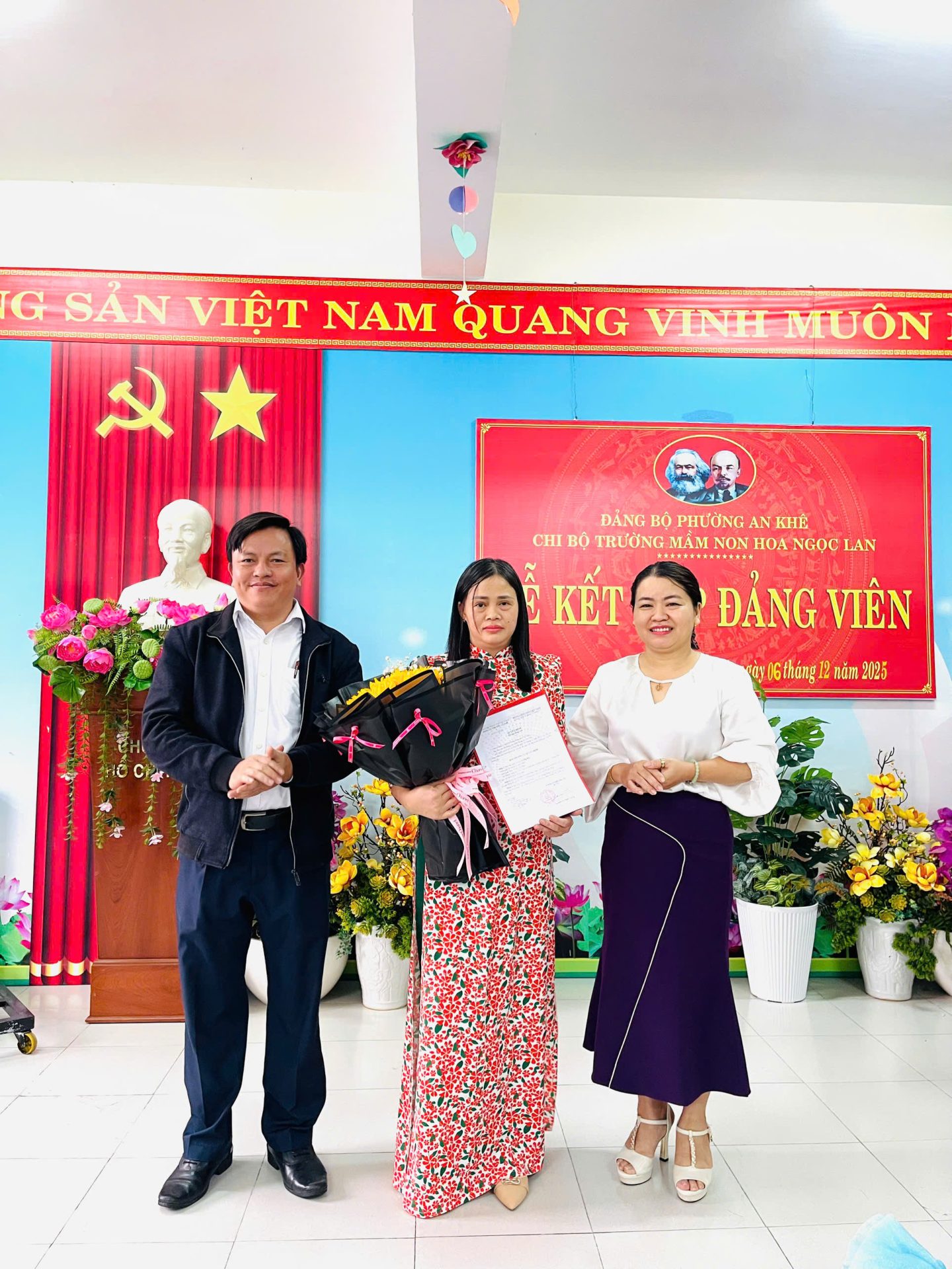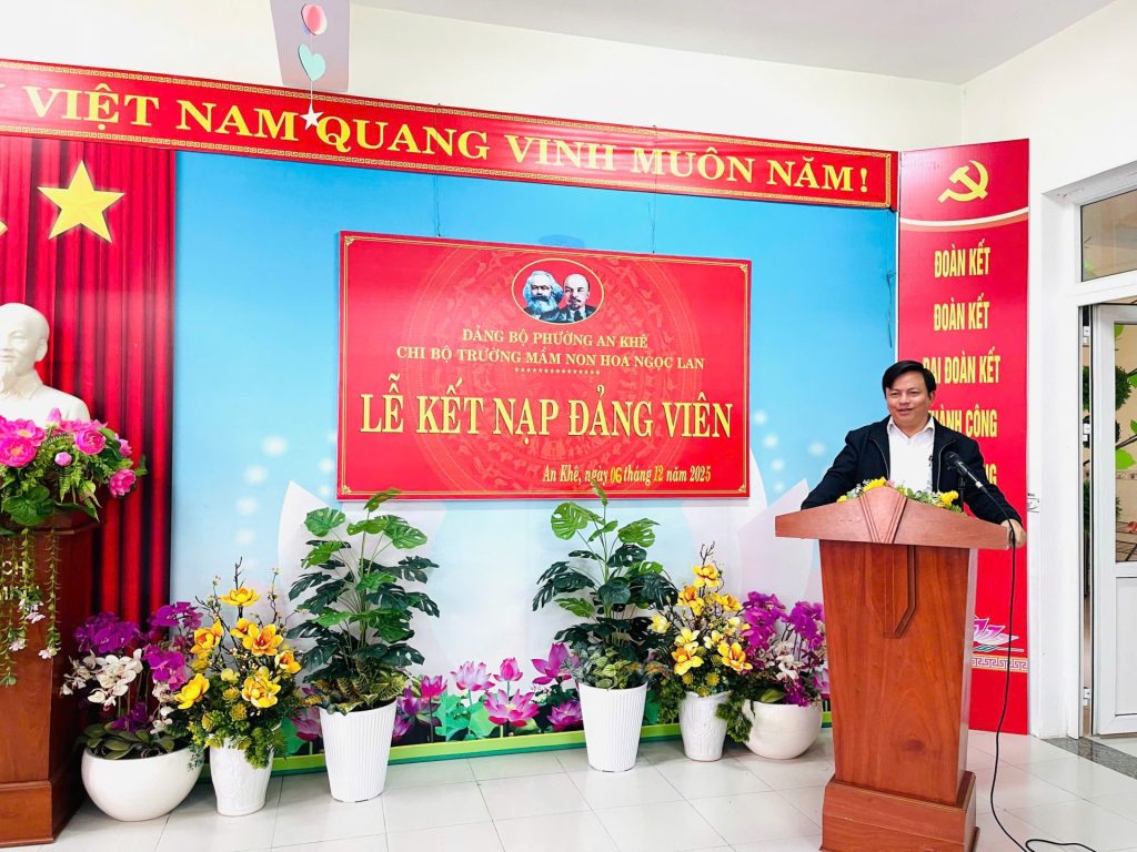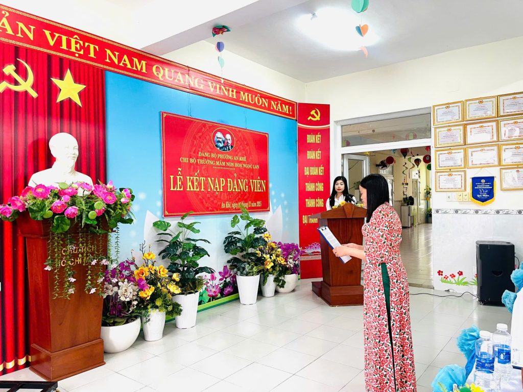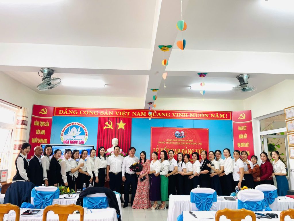 Ngày 06/12, Chi bộ Trường MN Hoa Ngọc Lan tổ chức kết nạp đảng viên cho quần chúng ưu tú Lê Thị Thu. Buổi lễ có sự tham gia của ông Nguyễn Kim Thành – ĐUV, Trường Ban VHXH HĐND và đại diện Ban xây dựng Đảng Đảng ủy phường An Khê theo dõi, hướng dẫn tổ chức theo đúng trình tự, thủ tục quy định của Điều Lệ Đảng Cộng sản Việt Nam.